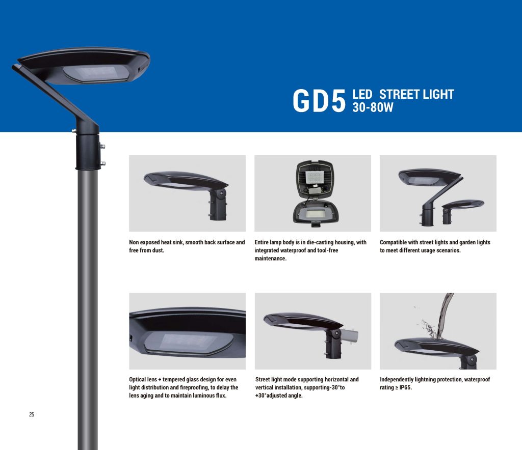 LED Street/Garden Light 30-80WPower Consumption: 30W – 80W Non exposed heat sink, smooth back surface and free from dust. Entire lamp body is in die-casting housing, with integrated waterproof and tool-free maintenance. Luminaire, Street Light0